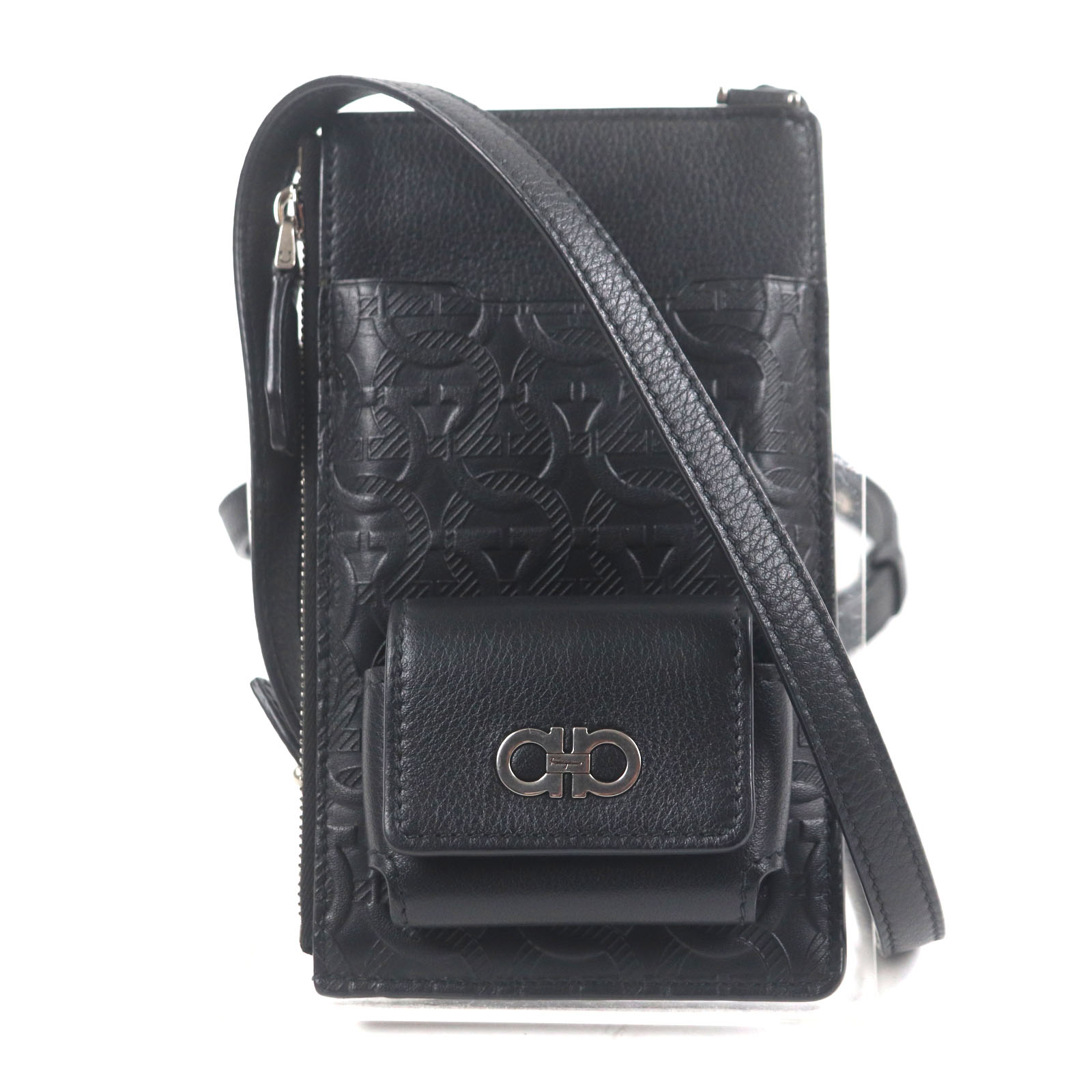 美品▼サルヴァトーレフェラガモ レザー ガンチーニエンボス エアポッズケース スマートフォン ショルダー ブラック 箱付き メンズ