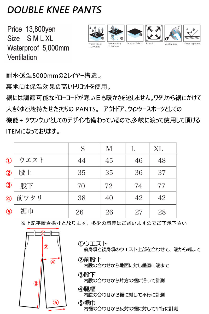 | コメント | 耐水・透湿5000mmの2レイヤー構造。 裏地には保温効果の高いトリコットを使用。。 裾には調節可能なドローコードが寒い日も暖かさを逃しません。 ワタリから裾にかけて大きくゆとりを持たせた拘りのDOUBLE KNEE PANTS。 アウトドア、 ウィンタースポーツとしての機能+タウンウェアとしてのデザインも備わっているので、多岐に渡って使用して頂けるアイテムになっております。 2016年にブランド REPUBLIC&CO は誕生。 アーバンライフからアウトドア、雪山まで視野に入れた高機能ウェアを展開。 特にスノーボードシーンでは独特のシルエットやデザインが評価され、若者層から絶大な支持を得ている。 REPUBLICがこだわり抜いたハイスペックな素材・独自のパターン設計はストレスのない体の動きをサポートし、アウトドアシーン、デイリーユース、アーバンスポーツにも活躍する機能性にも優れたアイテムを発信している。 ※こちらはパンツのみの販売となり、上下セット販売ではございませんのでご注意ください。 ※掲載写真の色合いは、PCモニター環境や撮影時の光環境により実物と若干違う可能性もございますのでご了承ください。 サイズ感や生地感などご不明点ございましたらお気軽にお問い合わせください。 サイズ感や生地感などご不明点ございましたらお気軽にお問い合わせください。 |
