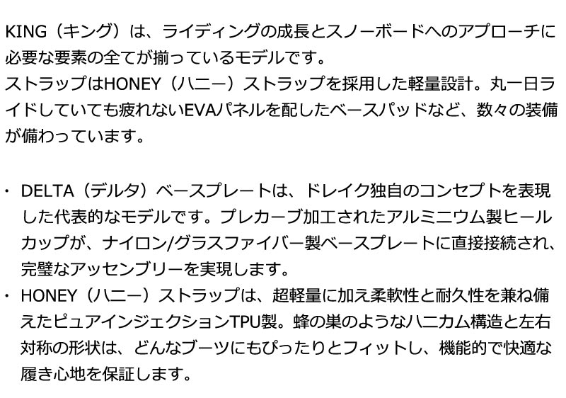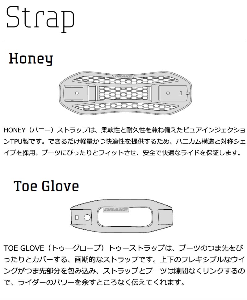 | コメント | ・ DELTA(デルタ)ベースプレートは、ドレイク独自のコンセプトを表現した代表的なモデルです。プレカーブ加工されたアルミニウム製ヒールカップが、ナイロン/グラスファイバー製ベースプレートに直接接続され、完璧なアッセンブリーを実現します。 ・ HONEY(ハニー)ストラップは、超軽量に加え柔軟性と耐久性を兼ね備えたピュアインジェクションTPU製。蜂の巣のようなハニカム構造と左右対称の形状は、どんなブーツにもぴったりとフィットし、機能的で快適な履き心地を保証します。 バインディングとブーツの相性やフィッティングに関して等、ご不明な点があればお気軽にお問い合わせください。 ※滑走での振動やストラップの着脱等でビスを使用している部分は緩んできますので、締り具合など滑走前に必ずご確認をお願いします。またご使用のブーツとストラップの調整をお願いいたします。調整が適切でない場合、負荷が集中し破損の原因となります。 |