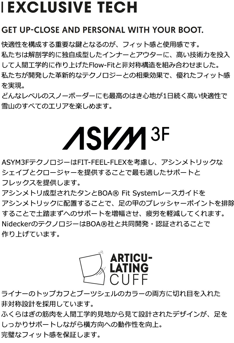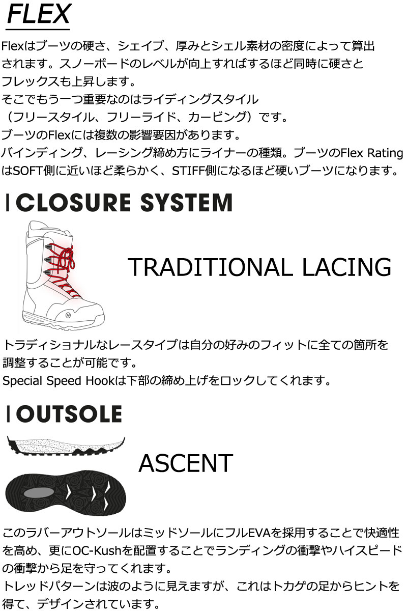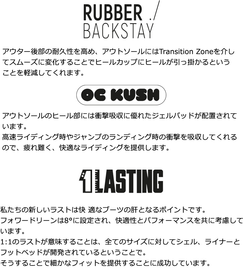 | コメント | RIFT, REFINED. 世界セールスNo.1のRiftが今年もラインアップされました。 ハイエンドフリースタイル・ブーツとして大人気なこのブーツはダブルBOA、レースにウィメンズバージョンとしてラインアップされます。 そして新しくデビューするRift APXには縫製フリーの下部セクションを可能にするKPU技術とArmor-Techを採用したトウボックスがビチャビチャの春雪でも高い防水性を発揮してくれます。 FLAWLESS FIT 横向きに立つことをより自然に感じられるよう、ブーツは高い快適性を提供できるよう設計されています。 2425のラインアップはフィットをネクストレベルに引き上げています。 全てのモデルが1:1でアウターとライナーで設計されているのでそのマッチングは類を見ないレベルです。 APXシリーズに関しては高いパフォーマンスはもちろんのこと。 縫製箇所が無いサイドパネルといった革新的なコンセプトも採用されています、新しいフラッグシップモデルIndexには、フル熱成型ライナー、革新的なヒールホールドシステム、ハイクアップ用カスタムカフ、ハイエンドVibramソールにアップグレードしたストームカバーが採用されています。 ものすごい数のディテールですが、小さなディテール一つ一つが最高のフィットをもたらすのです。 ブーツとバインディングの相性やフィッティング、サイズ感に関して等、ご不明な点があればお気軽にお問い合わせください。サイズ交換も当店在庫有りの範囲で対応可能ですので、詳しくはサイズ交換リンクをご確認下さい。 |