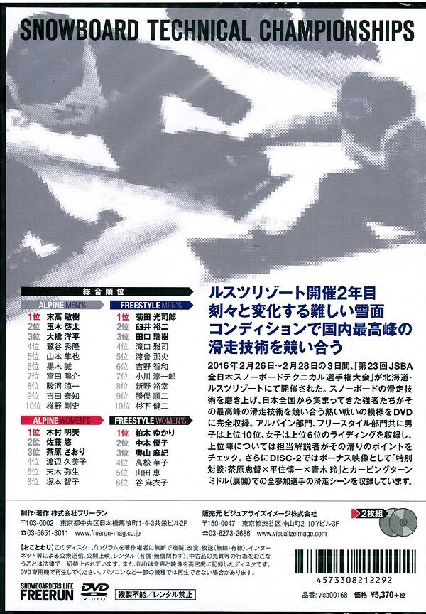 ☆ オープニング映像から全競技(FREESTYLE 及び ALPINE 男女上位選手)、インタビュー、表彰式などを収録。カービングターンミドル(展開)、カービングターンショート(ウェーブ)、カービングターンミドル、フリーライド自由、カービングターンロング、規定グライドスタイル、ジャイアントスラローム