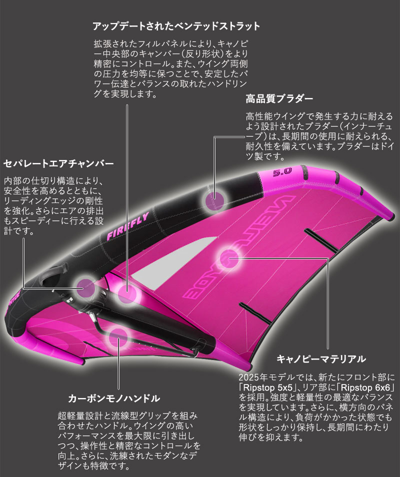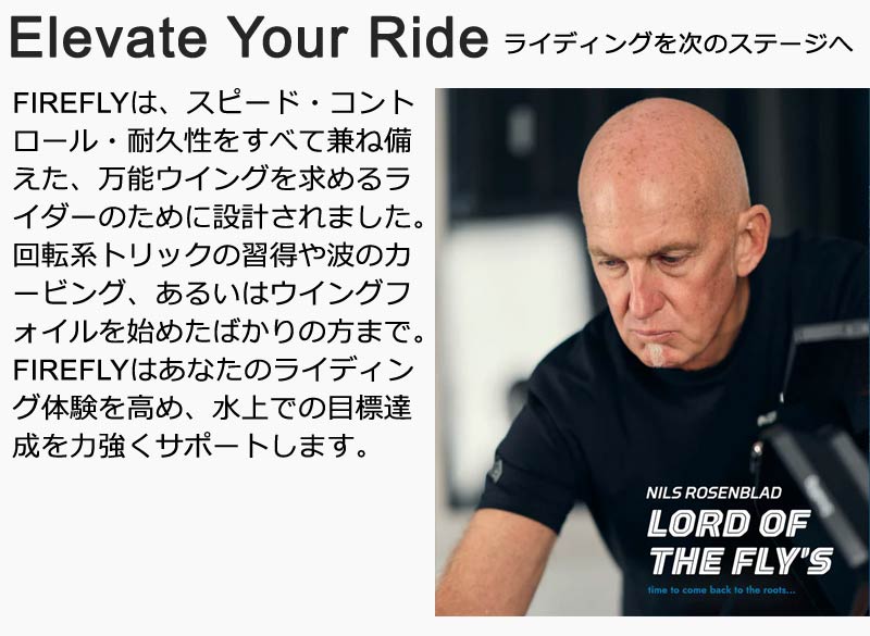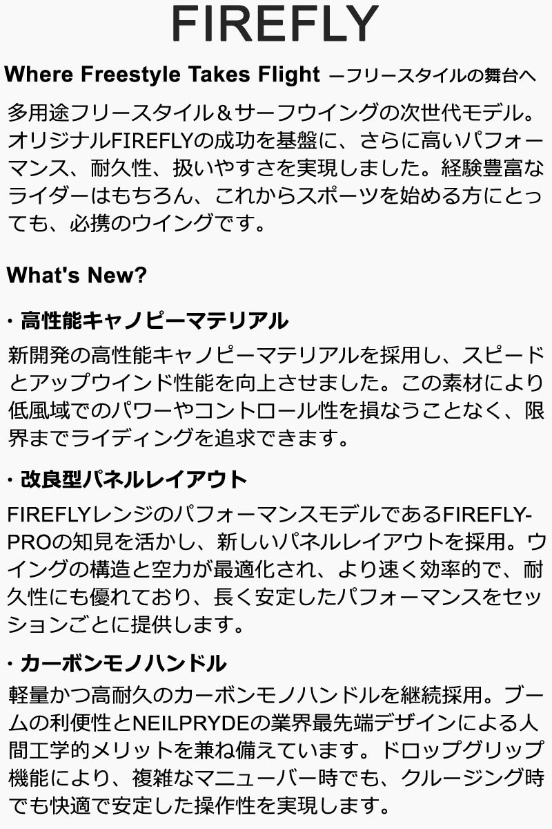 新たに登場したFIREFLYは、フリースタイルとサーフの両方で高いパフォーマンスを発揮する多用途ウイングの次世代モデルです。最新素材と、上位モデルから着想を得たデザイン改良により、さらに進化を遂げました。オリジナルFIREFLYの成功を基盤に、このアップデート版はパフォーマンス、耐久性、扱いやすさのすべてを向上。経験豊富なライダーはもちろん、これから始める方にとっても必携の一本です。