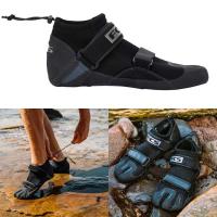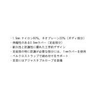 | 特徴 | ・1.5mm ナイロン80%、ネオプレーン20%(ボディ部分) ・伸縮性のある0.5mmラバー(足底部分) ・耐久性と防護性に優れた工学的デザイン ・足底部の特に防護が必要な部分には、1mmラバーを使用 ・ベルクロストラップで締め付けをサポート ・足首にはアジャスタブルロープを装備 |