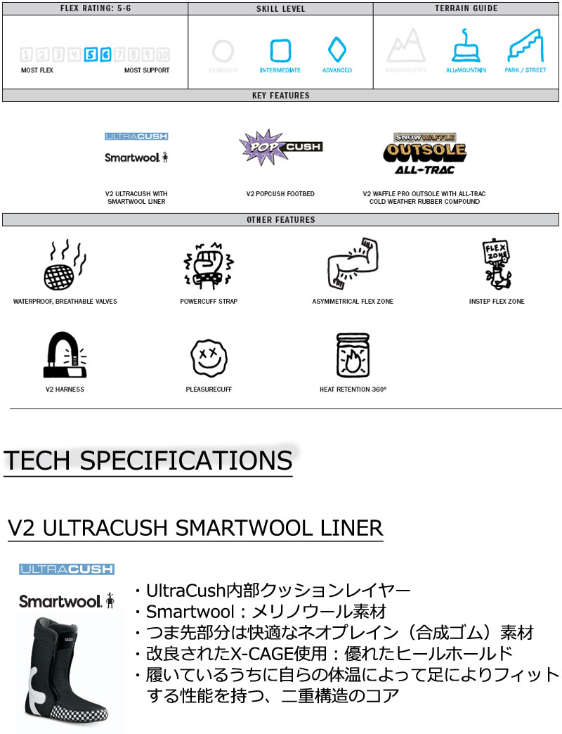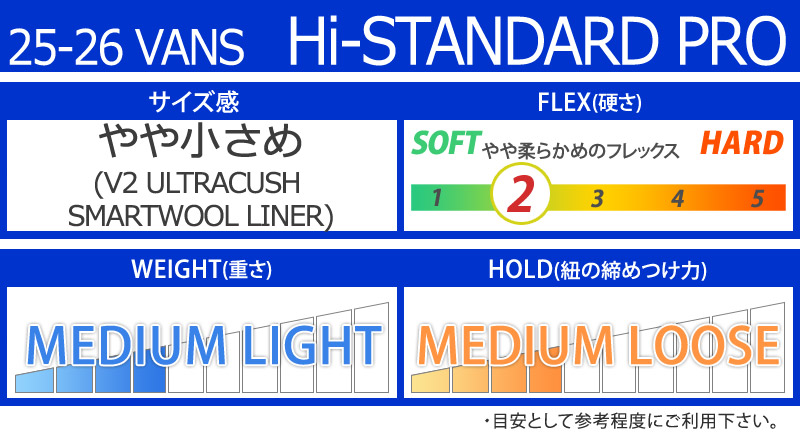 | コメント | Hi-Standard ファミリーのプロレベルの代表格。 Vansのスノーボードブーツの中で最も有名なこのモデルの最新作は、パフォーマンスとスタイルの両方を兼ね備える。 V2コンポーネントとプログレッシブヘリテージに支えられ、間違いなく今までで最もプロフェッショナルなHi-Standardが誕生。 ブーツとバインディングの相性やフィッティング、サイズ感に関して等、ご不明な点があればお気軽にお問い合わせください。サイズ交換も当店在庫有りの範囲で対応可能ですので、詳しくはサイズ交換リンクをご確認下さい。 |
