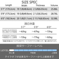 サイズ | 5'7"(170.2cm)* 19 1/8(48.6cm)*2 3/8(6.03cm) CL値:約25.86 5'9"(175.3cm)*19 5/8(49.9cm)*2 1/2(6.35cm) CL値:約28.76 6'0"(182.9cm)*20 1/8(51.1cm)*2 11/16(6.83cm) CL値:約32.98 |
