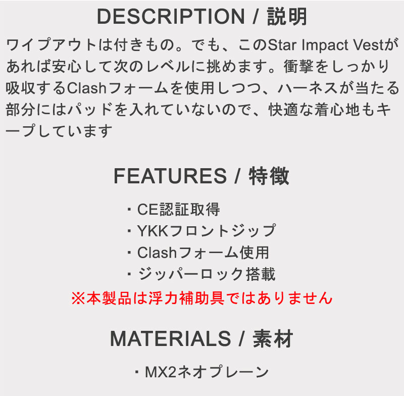| コメント | 【説明】 ワイプアウトは付きもの。でも、このスターインパクトベストがあれば安心して次のレベルに挑めます。 衝撃をしっかり吸収するクラッシュフォームを使用しつつ、ハーネスが当たる部分にはパッドを入れていないので、快適な着心地もキープしています。 【特徴】 ・CE認証取得 ・YKKフロントジップ ・Clashフォーム使用 ・ジッパーロック搭載 【素材】 ・MX2ネオプレーン ※本製品は浮具・浮力補助具ではありません ※サイズスペックはカタログ上のデータを掲載しております。着用感は個人差があります。 |