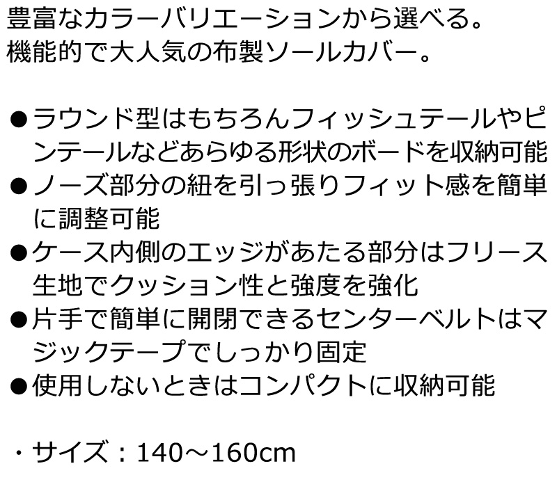 | コメント | 豊富なカラーバリエーションから選べる。機能的で大人気の布製ソールカバー。 ●ラウンド型はもちろんフィッシュテールやピンテールなどあらゆる形状のボードを収納可能 ●ノーズ部分の紐を引っ張りフィット感を簡単に調整可能 ●ケース内側のエッジがあたる部分はフリース生地でクッション性と強度を強化 ●片手で簡単に開閉できるセンターベルトはマジックテープでしっかり固定 ●使用しないときはコンパクトに収納可能 SIZE / 140〜160cm ※掲載写真の色合いは、PCモニター環境や撮影時の光環境により実物と若干違う可能性もございますのでご了承ください。 サイズ感、見え方等、ご不明な点があればお気軽にお問い合わせください。 |
