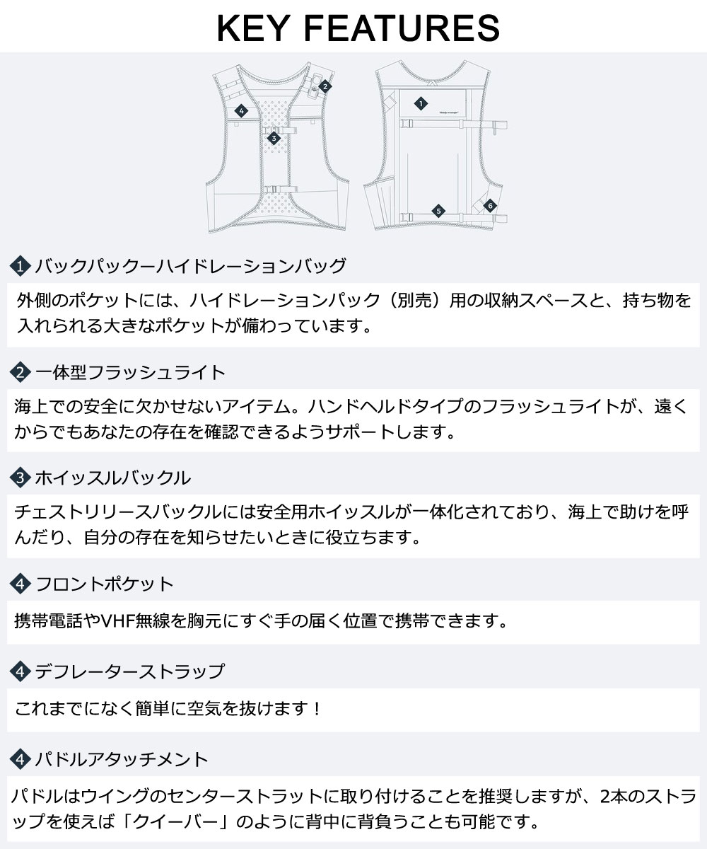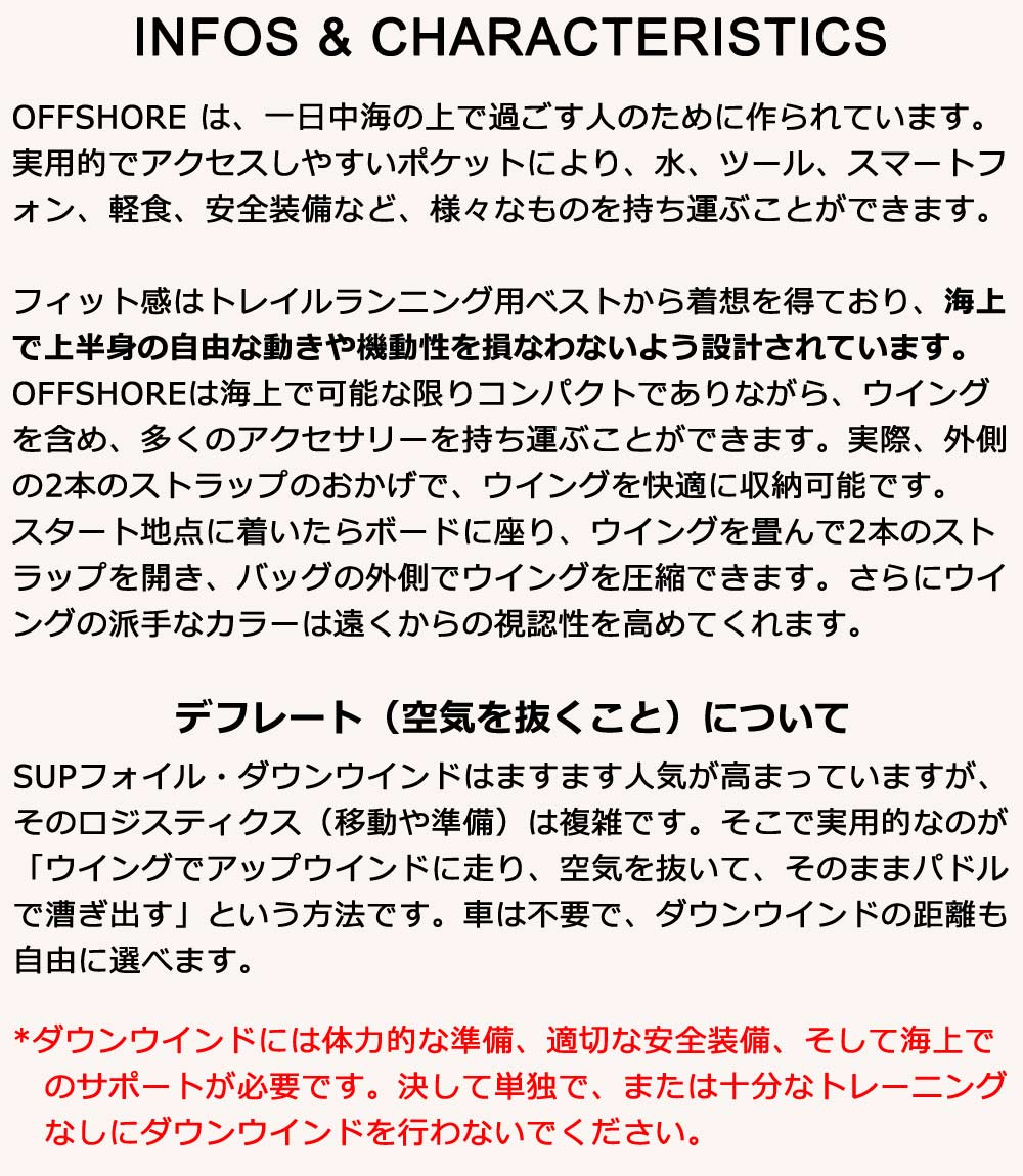| 特徴 | OFFSHORE は、一日中海の上で過ごす人のために作られています。 実用的でアクセスしやすいポケットにより、水、ツール、スマートフォン、軽食、安全装備など、様々なものを持ち運ぶことができます。 フィット感はトレイルランニング用ベストから着想を得ており、海上で上半身の自由な動きや機動性を損なわないよう設計されています。 OFFSHOREは海上で可能な限りコンパクトでありながら、ウイングを含め、多くのアクセサリーを持ち運ぶことができます。 実際、外側の2本のストラップのおかげで、ウイングを快適に収納可能です。 スタート地点に着いたらボードに座り、ウイングを畳んで2本のストラップを開き、バッグの外側でウイングを圧縮できます。 さらにウイングの派手なカラーは遠くからの視認性を高めてくれます。 【パドルアタッチメントに関して】 太いシャフトの場合、ストラップが外れる恐れがございます。ご注意ください。 ※本製品は浮き具・浮力補助具ではありません。 ※サイズスペックはカタログ上のデータを掲載しております。着用感は個人差があります。 |