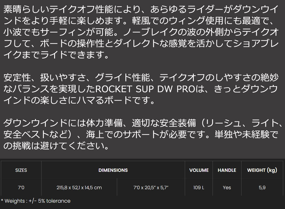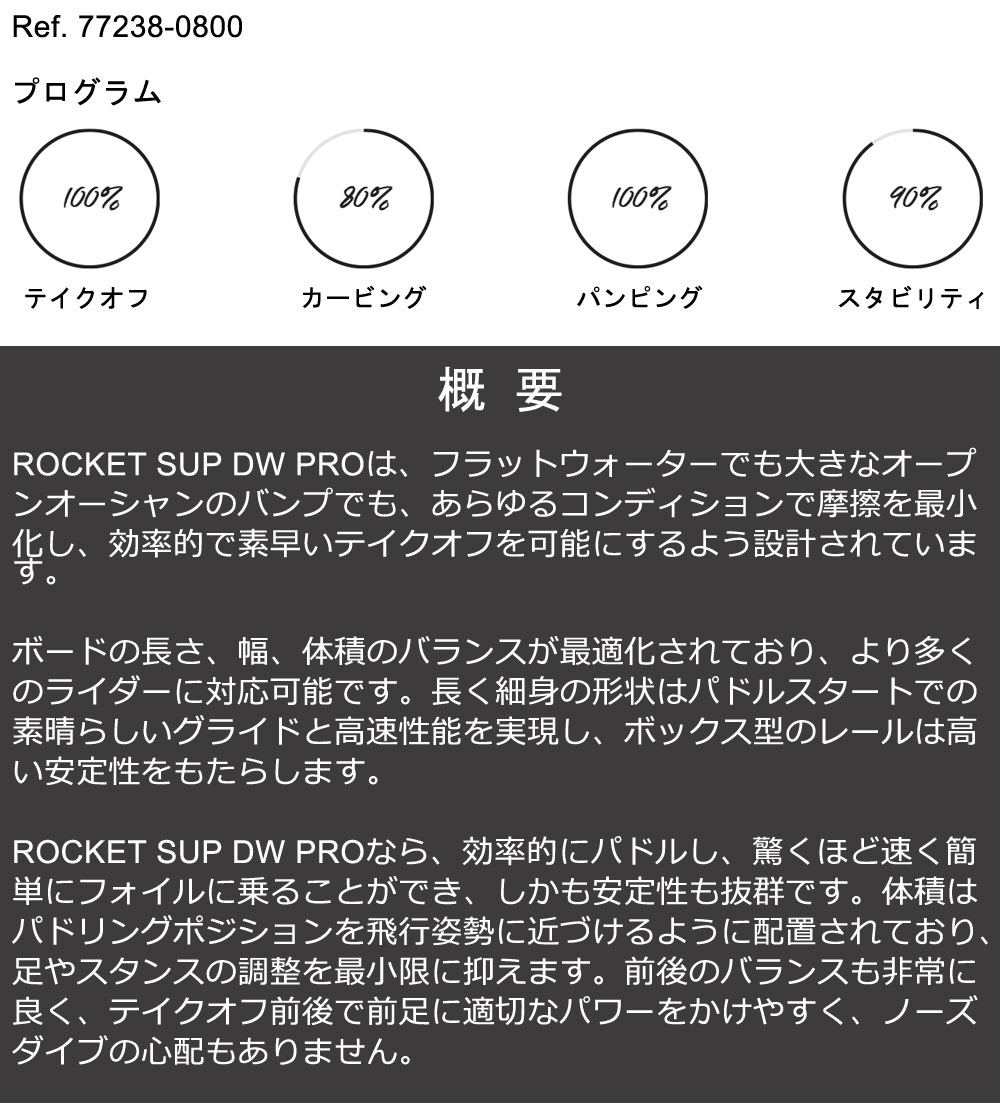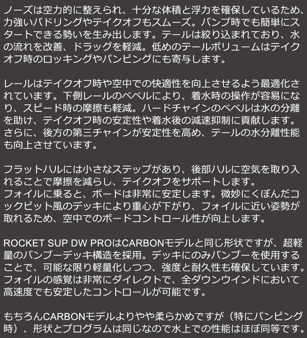 | コメント | ROCKET SUP DW PROボードで、ダウンウインドならではの高揚感と自由を体感してください。 最適化されたスリークなデザインと超軽量バンブー構造により、これまでになく素早いフォイルに乗り上がり、うねりの上を何時間でも飛ぶように滑る、至福のライディングをお楽しみいただけます。 ・驚くほど効率的でスピーディーなテイクオフ ・常に優れた安定性 ・圧倒的なグライド性能とスピード ・前足、後ろ足のバランスが取りやすい設計 ・高速域でも優れたコントロール性と操作性 |