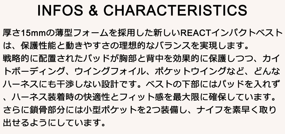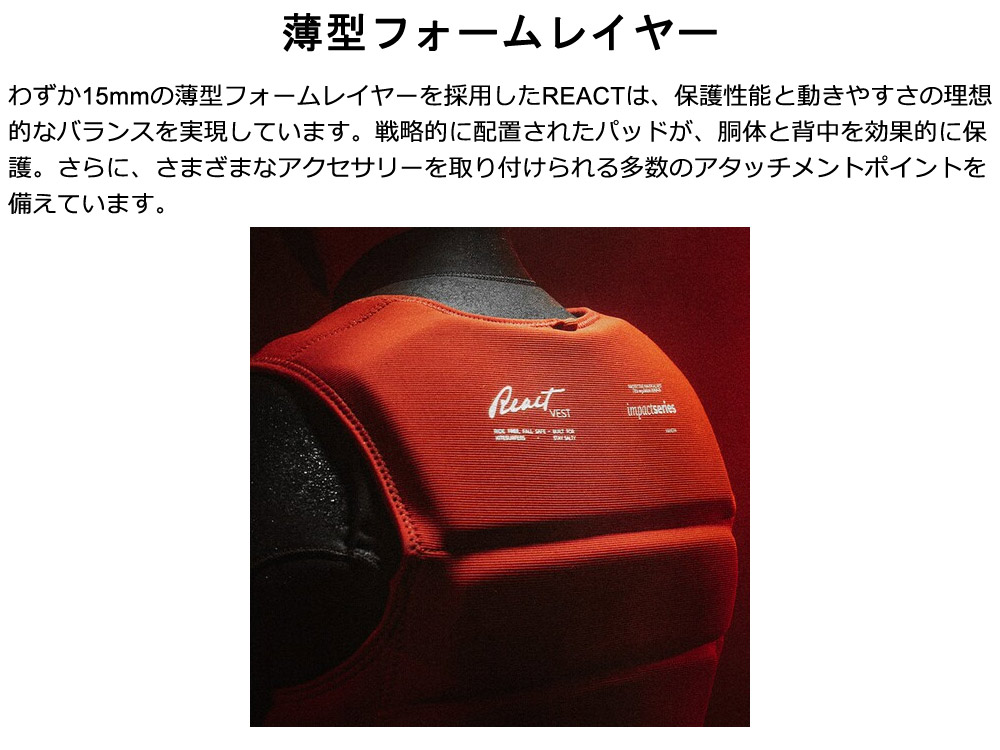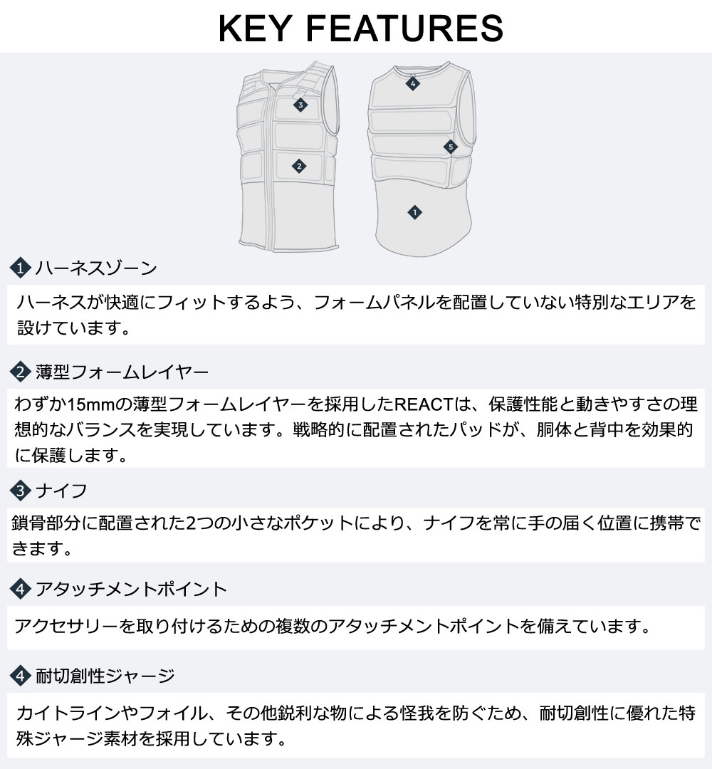 | 特徴 | 厚さ15mmの薄型フォームを採用した新しいREACTインパクトベストは、保護性能と動きやすさの理想的なバランスを実現します。 戦略的に配置されたパッドが胸部と背中を効果的に保護しつつ、カイトボーディング、ウイングフォイル、ポケットウイングなど、どんなハーネスにも干渉しない設計です。ベストの下部にはパッドを入れず、ハーネス装着時の快適性とフィット感を最大限に確保しています。 さらに鎖骨部分には小型ポケットを2つ装備し、ナイフを素早く取り出せるようにしています。 ※本製品は浮き具・浮力補助具ではありません。 ※サイズスペックはカタログ上のデータを掲載しております。着用感は個人差があります。 |
