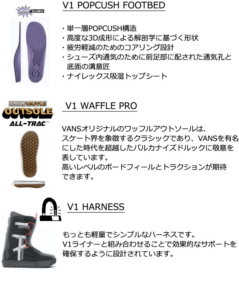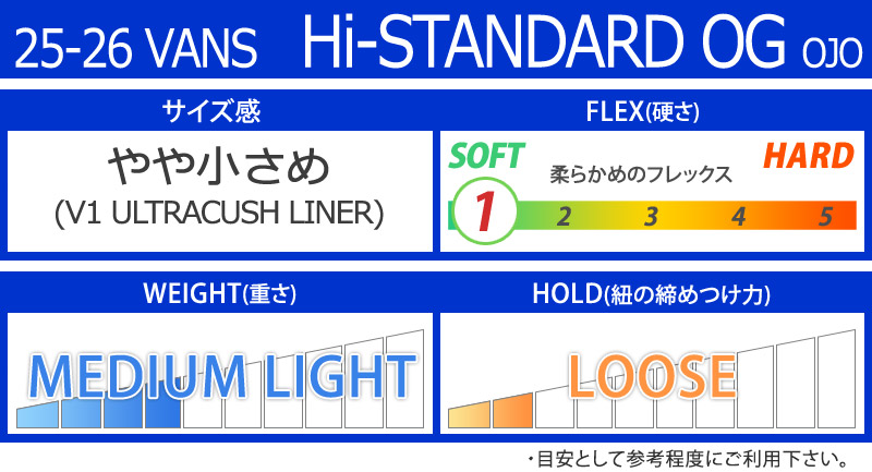 | コメント | Hi-Standard OGは、Vansのベストセラーブーツとして、クラシックなスタイルとモダンなパフォーマンス性能を表現し続けている。 伝統的なレースアップクロージャーの快適さと親しみやすい感触が、インステップレースロックアウトやインターナルウェブハーネスなどの機能によってさらにサポートされている。 また、V1 Waffle Lugアウトソールとサイドストライが、VANSの普遍的なスタイルを象徴している。 ブーツとバインディングの相性やフィッティング、サイズ感に関して等、ご不明な点があればお気軽にお問い合わせください。サイズ交換も当店在庫有りの範囲で対応可能ですので、詳しくはサイズ交換リンクをご確認下さい。 |