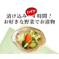 きゅうり、白菜、セロリ、やまいも、にんじん、キャベツ、らっきょう、エシャレット等、新鮮な野菜をお好みの長さに切り、ポリ袋に入れ密封すれば、約4時間でまろやかな味の一夜漬けが出来上がります。