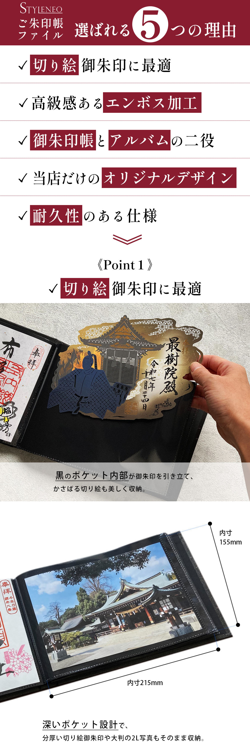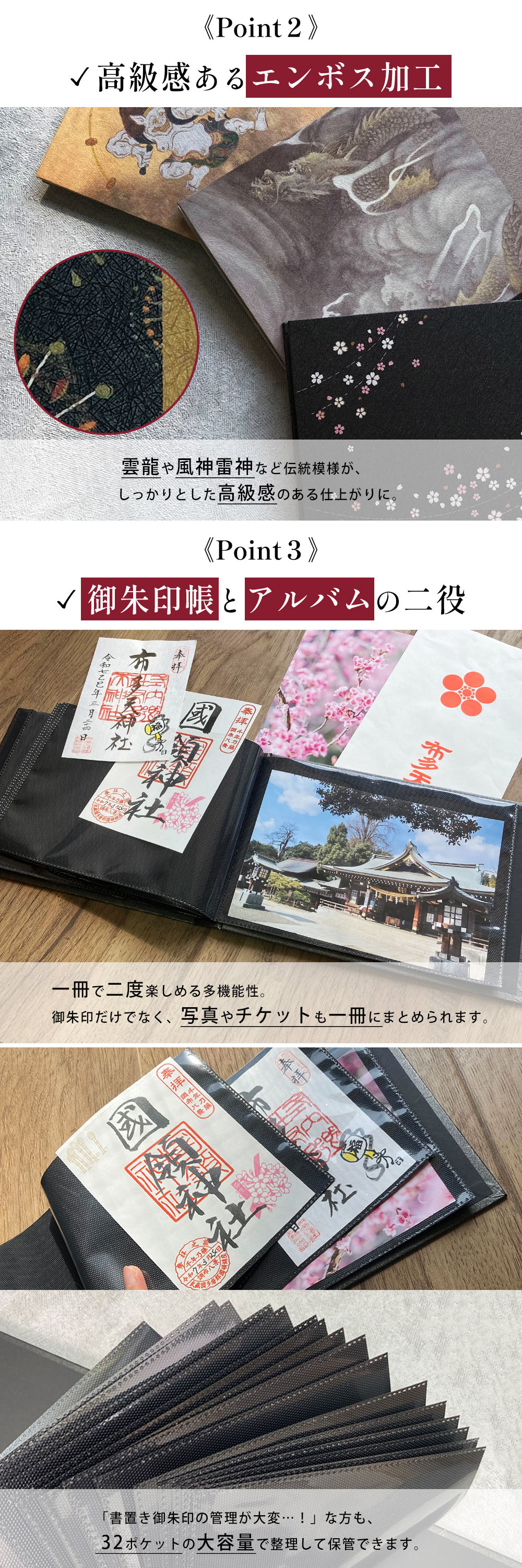 | 【他店ではなく当商品が選ばれる4つの理由】 1. 切り絵・見開き御朱印に最適化された設計 2. 職人のこだわりを感じるエンボス加工の表紙 3. 御朱印帳とアルバムの二役をこなす多機能性 4. 他にはないオリジナルデザイン |
