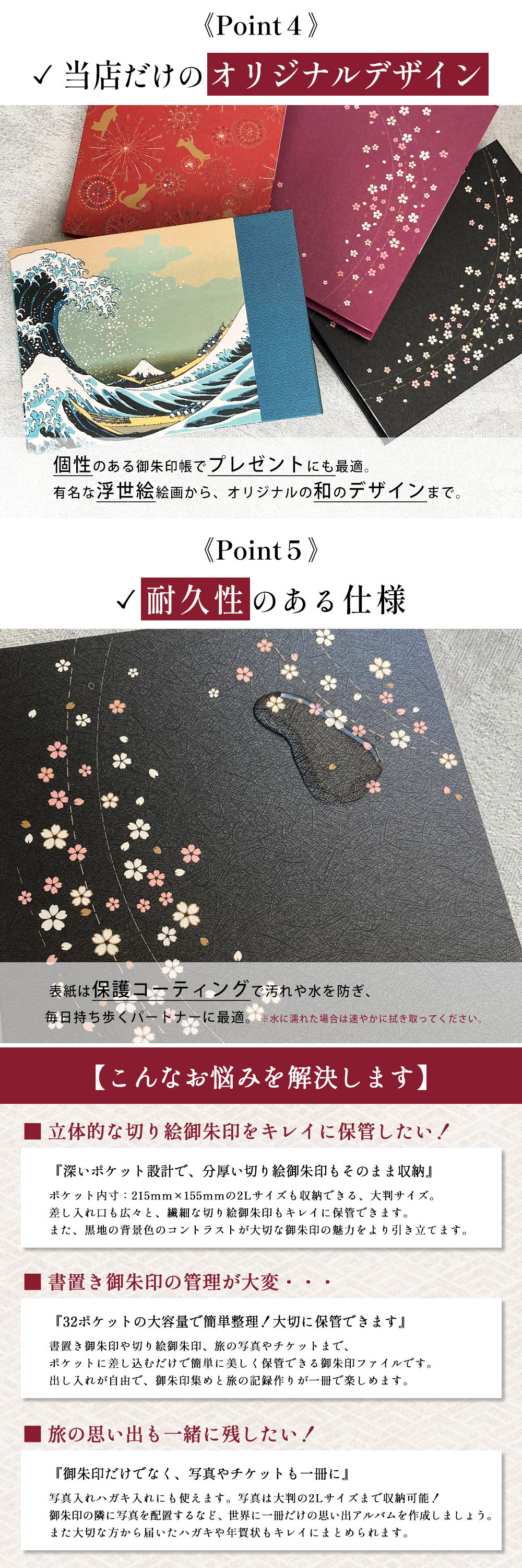 | 【こんなお悩みを解決します】 ● 立体的な切り絵御朱印を、折らずにキレイに保管したい… → 深いポケット設計で分厚い切り絵御朱印もそのままの状態でしっかり収納 ● 書置きの御朱印が増えて、管理が大変… → 32ポケットの大容量でたくさんの書置き御朱印を整理して保管 ● 御朱印と一緒に、旅の写真やパンフレットも残したい… → マルチユースなアルバムデザインで思い出の品々を一冊にまとめて作成 |