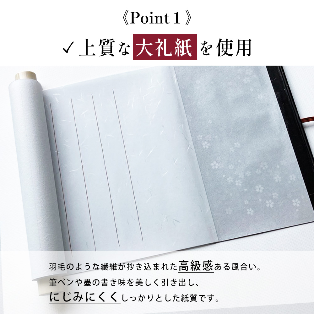| 1. 上質な大礼紙使用 羽毛のような繊維が高級感ある風合い。にじみにくい紙質。 |