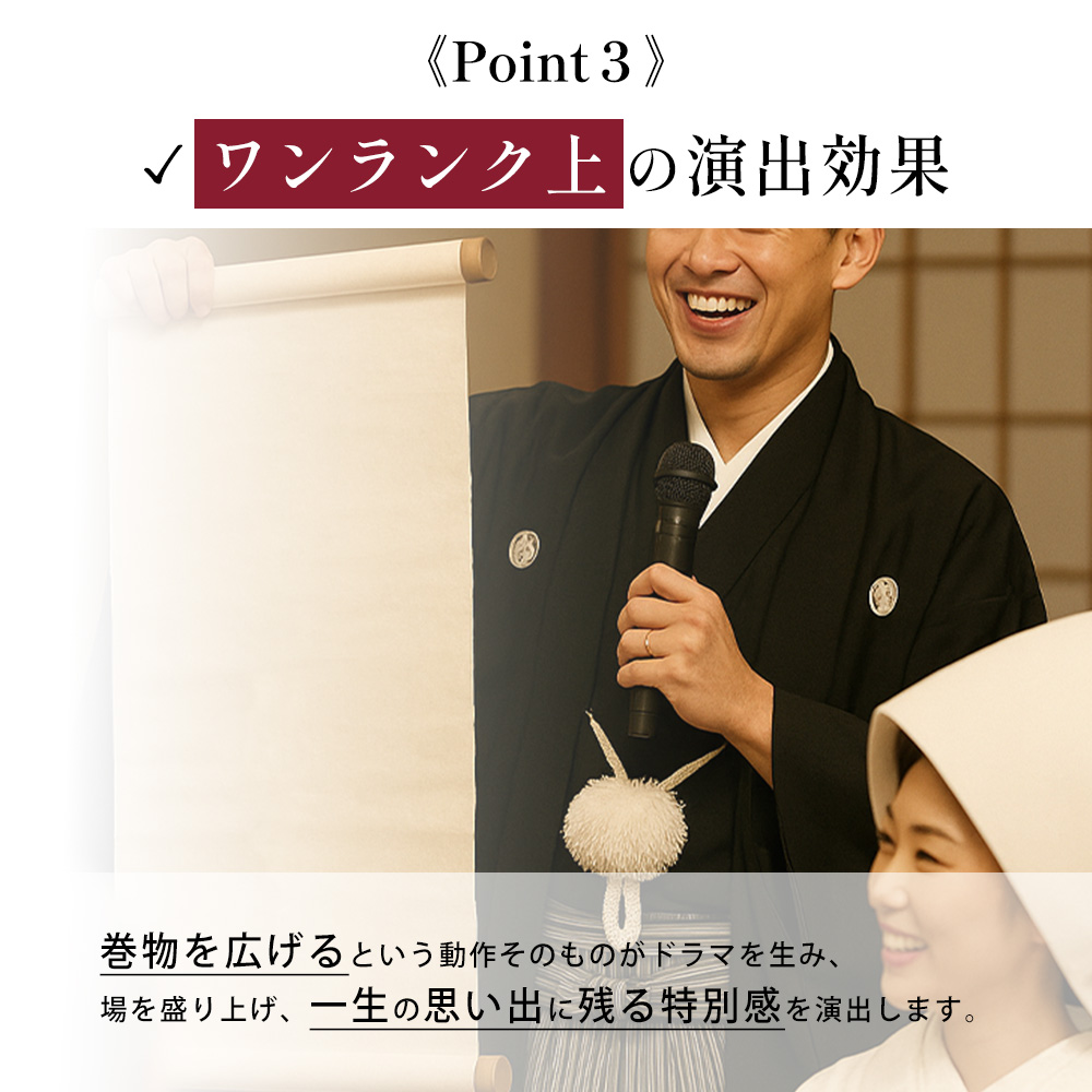 | 「結婚式のスピーチで印象に残るものを」 → 巻物を広げるだけで場の空気が一変。最高の演出アイテムに。 |
