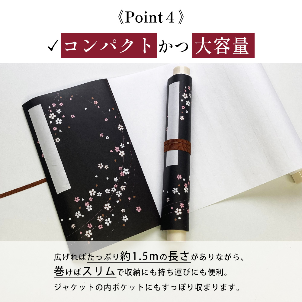 | (1) シーンを選ぶ: 結婚式のスピーチ / 披露宴の芳名録 / 展覧会の記帳など (2) いざ実践: 1. 巻物を広げ、メッセージをしたためる 2. 書き終わったら巻き戻す 3. ドラマチックに広けて想いを伝える (3) 使い方のコツ: ・筆を使用する場合は、にじみを防ぐため下敷きをご使用ください。 |