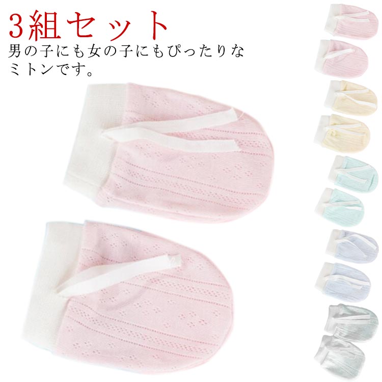 ひっかき防止 ベビーミトン 手袋 左右兼用 3組セット ミトン 新生児 赤ちゃん 出産祝い かきむしり防止 柔らかい 通気性 コットン ベビーミトン