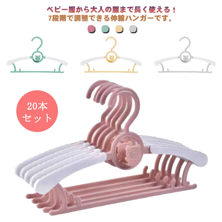 | ベビー服から大人の服まで長く使える!7段階で調整できる伸縮ハンガーです。 真ん中のクマのモチーフを採用した空間にフックを差し込むことで縦に連結させられます。 肩部分に滑り止め付きなので、服が滑り落ちにくく、安心して大切な服を吊るしておけます。 フック付きなのでキャミソールやスカートなども形を崩すことなく干せます。 お洋服の肩に当たる部分が丸みを帯びた形で作られているため、衣類を傷つけにくいのが特徴です。 | |