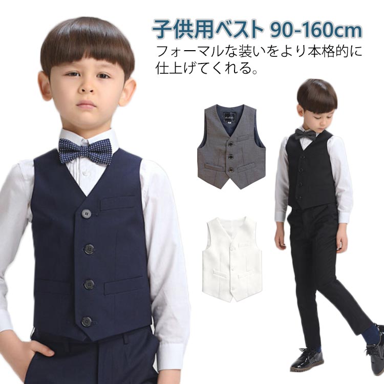 | 子供用ベスト 90-160cm フォーマルな装いをより本格的に仕上げてくれる。 無地でコーディネートに合わせて幅広い着こなしができるのが魅力です。 ご入卒や発表会、結婚式などのオケージョンシーンに1つ持っていると重宝するアイテム。 | |