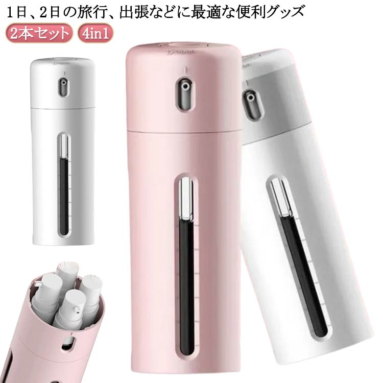 | 2本セット 1日、2日の旅行、出張などに最適な便利グッズ トラベルボトルの中には四個の容器が内臓されているので、容器に別々の液体(シャンプー、化粧水,トリートメントなど)を収納することができます。 ボトル一つで、四種類の液体を収納できる。トラベルボトルでは、容器1つで4種類の(シャンプー、化粧水、トリートメントなど)を持ち運ぶ事ができるので、バッグ、キャリーバッグの中身も困りません。 トラベルボトルは、収納したまま使用することができますので、一つ、一つを取り出す必要もなく切り替える事で別々の物をボトル一つでお使い頂けます。 内部ボトルの容量が一目でわかるデザインとなっているので、容量を足したり、入れ替えを行うなどスムーズに行う事ができます。 | |