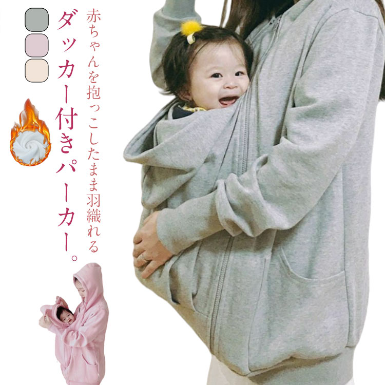 赤ちゃんを抱っこしたまま羽織れるダッカー付きパーカー。裏起毛なのでママとベビーを暖かく包んでくれます。