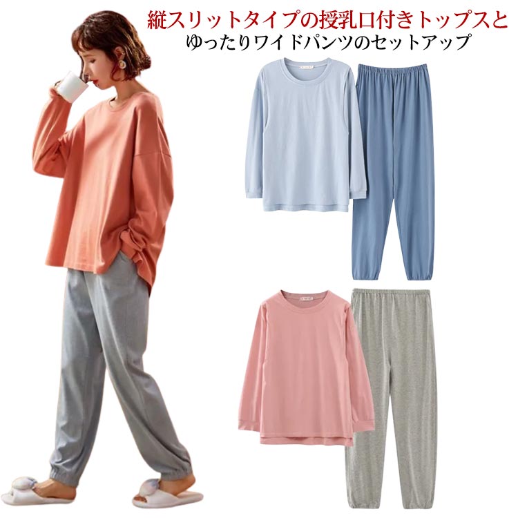 | 縦スリットタイプの授乳口付きトップスとゆったりワイドパンツのセットアップ。 なめらかで落ち感のある薄手素材で室内であればシーズン問わずお使いいただけます。 落ち感があり、体型カバーをしながらすっきりとしたシルエットを演出。 パンツのお腹周りはウエスト調整アジャスター付き、安定感のある着用感を実現しました。 セパレートなので単品使いもでき妊娠期〜授乳期まで対応します。リラックスタイムやパジャマ、近所のおでかけに。 | |