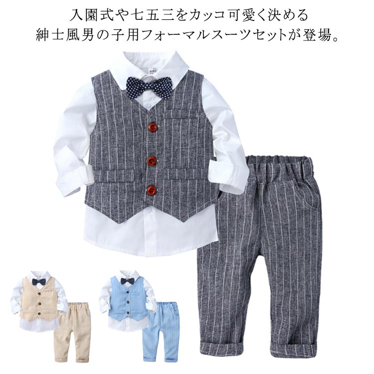 | ・入園式や七五三をカッコ可愛く決める紳士風男の子用フォーマルスーツセットが登場。 ・シャツ、ベスト、ボトムスのお買い得な3点セット。 ・ベストは広めに開いたVネックラインにシンプルなフェイクポケットで大人らしさを感じさせる一品。 ・ボトムスのウエストはゴム仕様なので快適に過ごせ、着脱もしやすい♪ ・長袖シャツは蝶ネクタイ付き。(※蝶ネクタイは取り外し不可) | |