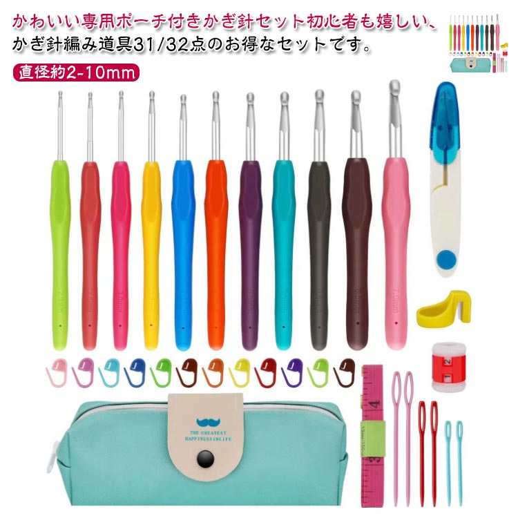 | かわいい専用ポーチ付きかぎ針セット初心者も嬉しい、かぎ針編み道具31/32点のお得なセットです。 ソフトグリップは手に優しくフィットして持ちやすい形状、長時間使っても疲れにくい仕様です。 糸が外れにくく、引きやすい、目が落ちにくい形状の針先。 各サイズで色分け!見た目もポップで管理がしやすい。 号数の表記が掘ってあるため、擦れ消えて太さがわからなくなることがありません。 とじ針は高品質な合金を採用、曲がりにくく滑らか、耐久性に優れています。 ケースはかぎ針編みとアクセサリーが全て保管でき、コンパクトで持ち運びにも便利。 | |