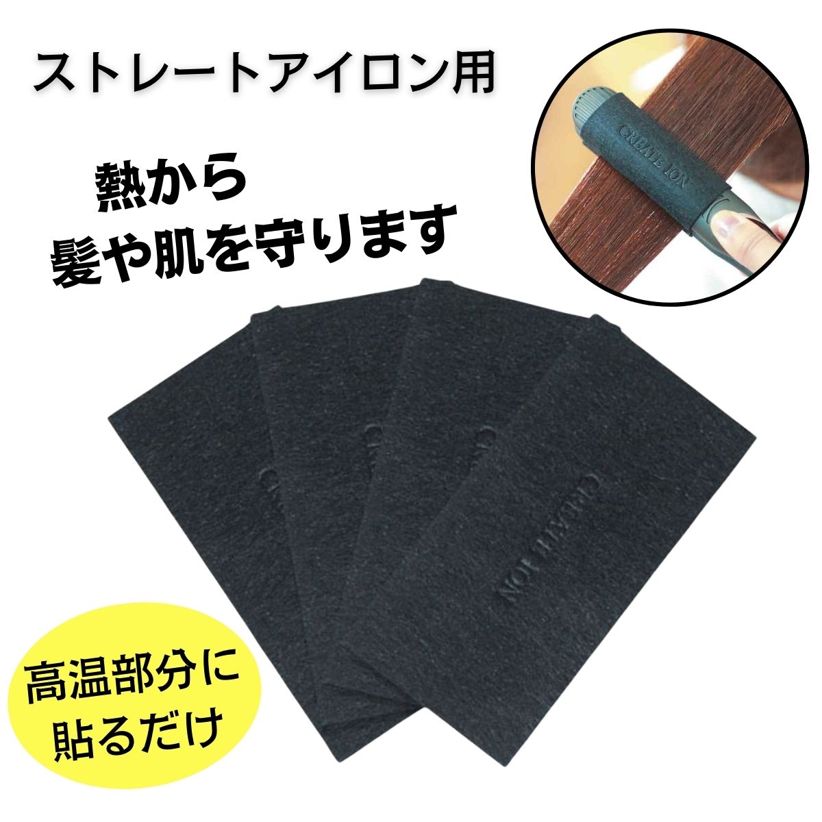ストレートタイプのヘアアイロンに貼るだけで、アイロン高温度部分の熱から髪や肌を守ります。