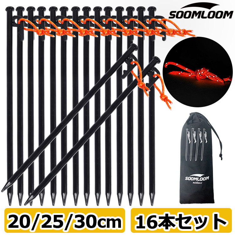 ペグ スチールペグ(16本セット)(25cm)(20cm)(30cm) (28cm)Soomloom ソリッド テント キャンプ設営用具 砂地 草地用 タープペグ ペグセット ゴムロープ付き