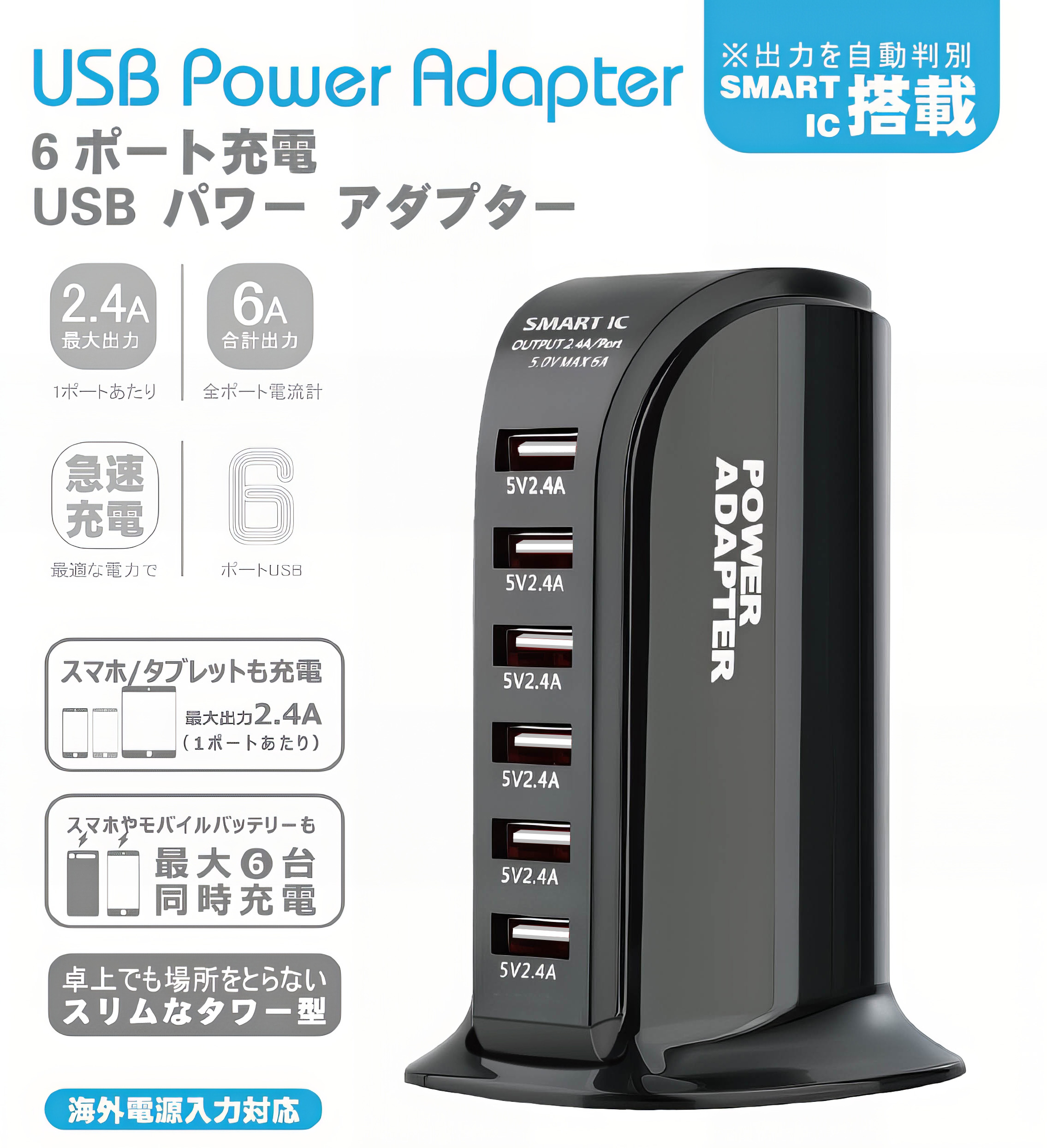 スペック:USBポート数:6、最大出力:2.4A、合計出力:6A