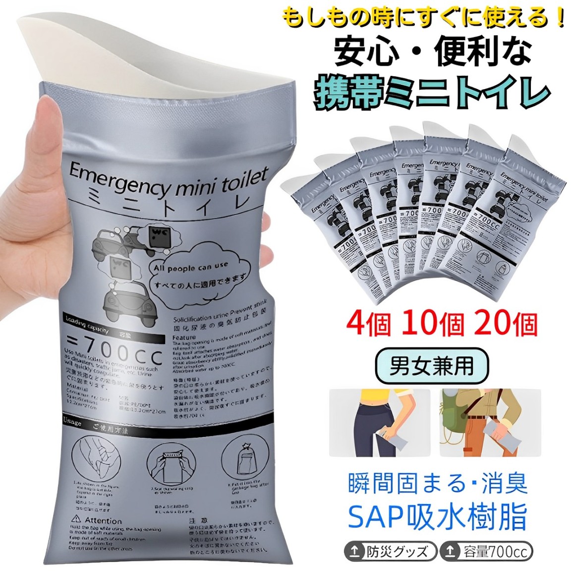 簡易トイレ 車 携帯トイレ 除菌 消臭 非常用 トイレ 渋滞 介護 防災グッズ 登山 男女兼用 700cc 4個 折り畳み 携帯 小便 おしっこ 女性 女性用 キャンプ用品