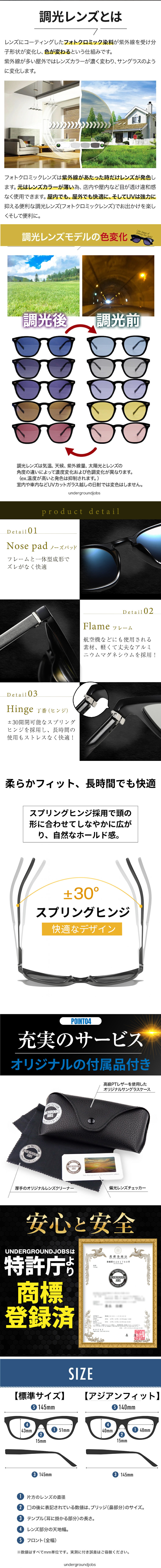 | 素材 | フレーム材質:プラスチック テンプル材質:チタン合金 レンズ材質:プラスチック(アクリル)※調光偏光レンズ |
