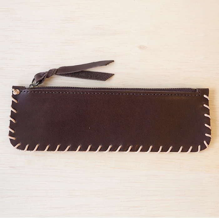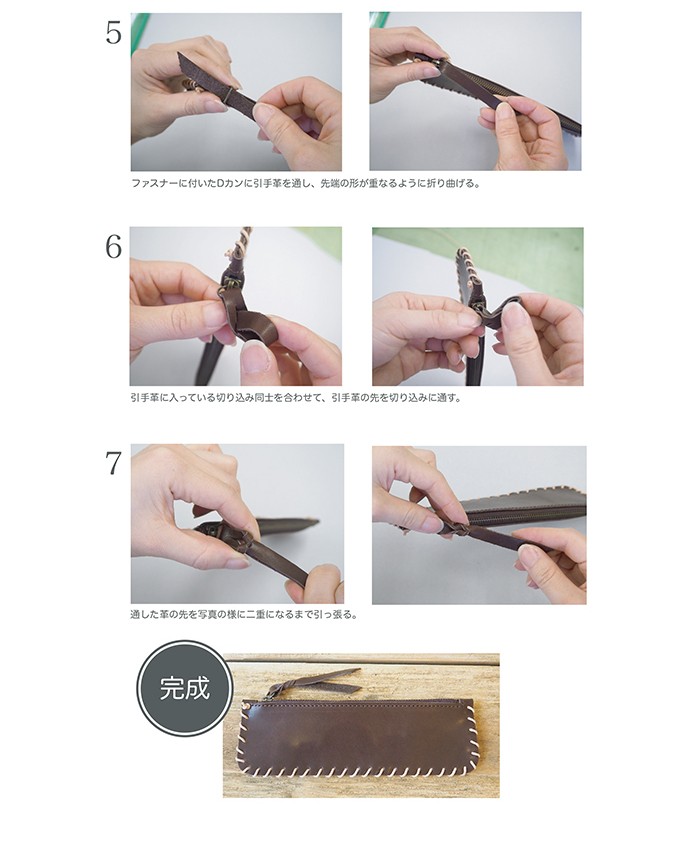 本革を使った本格的なペンケースですが、ファスナーは先に縫い付けてあるので革ひもを通して組み立てて革の引っ張りを付けて完成です☆