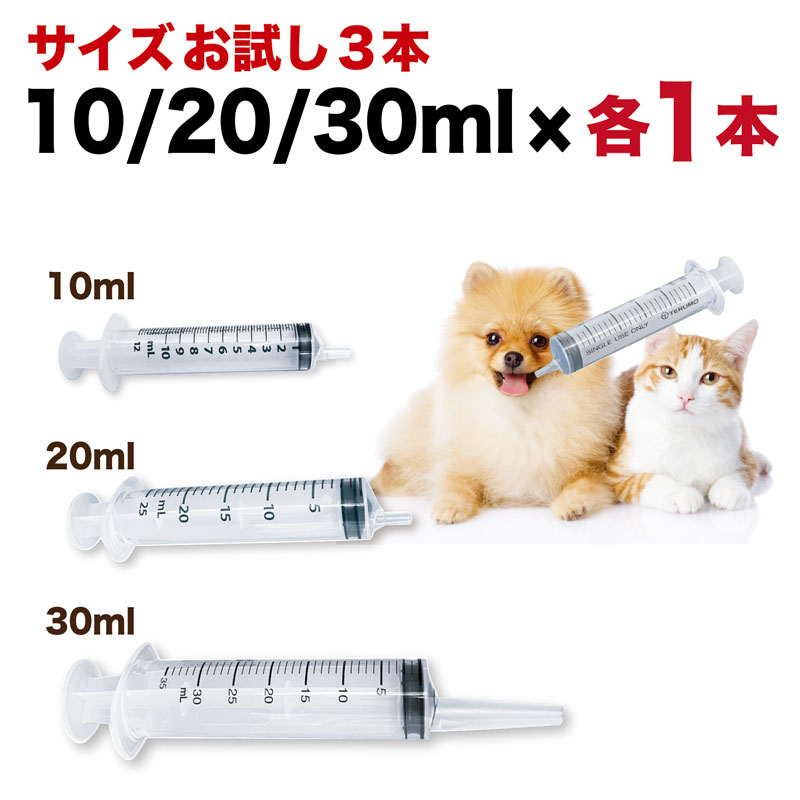 シリンジ ペット10ml 20ml 30ml ×各1本 犬 猫 高齢 老猫 老犬 投薬 介護 給餌 薬 流動食 針なし 横口 注射器 スポイトお水 薬を与える 乳酸菌 免疫