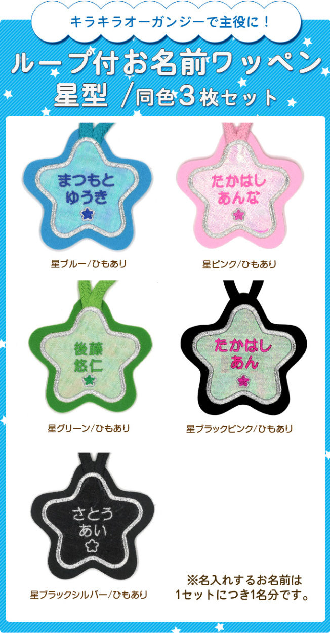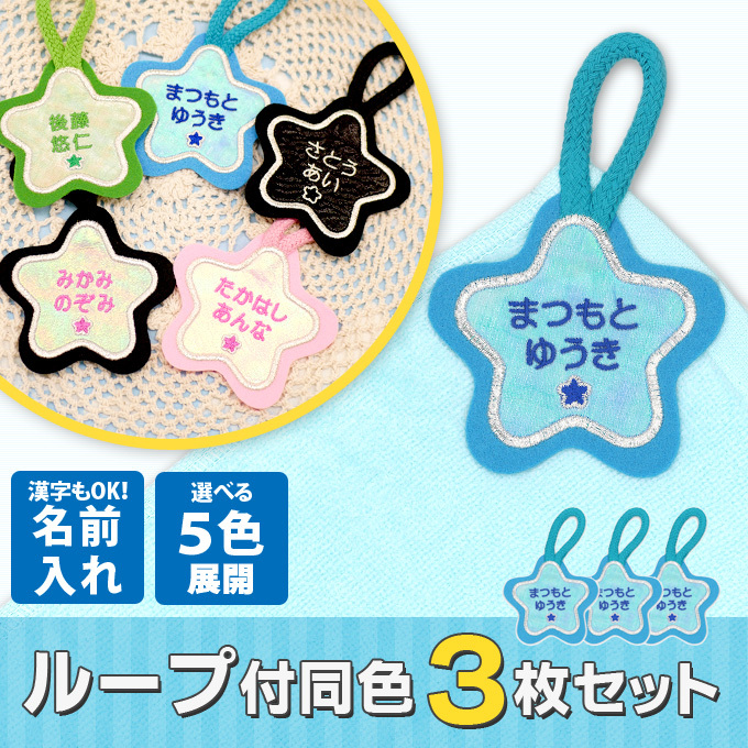 お名前ワッペン ループ タオル掛け 星 3枚組 ネームワッペン アイロン 入園 刺繍 プレゼント OR