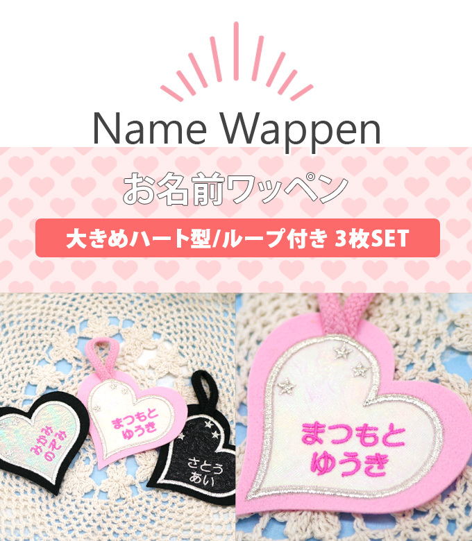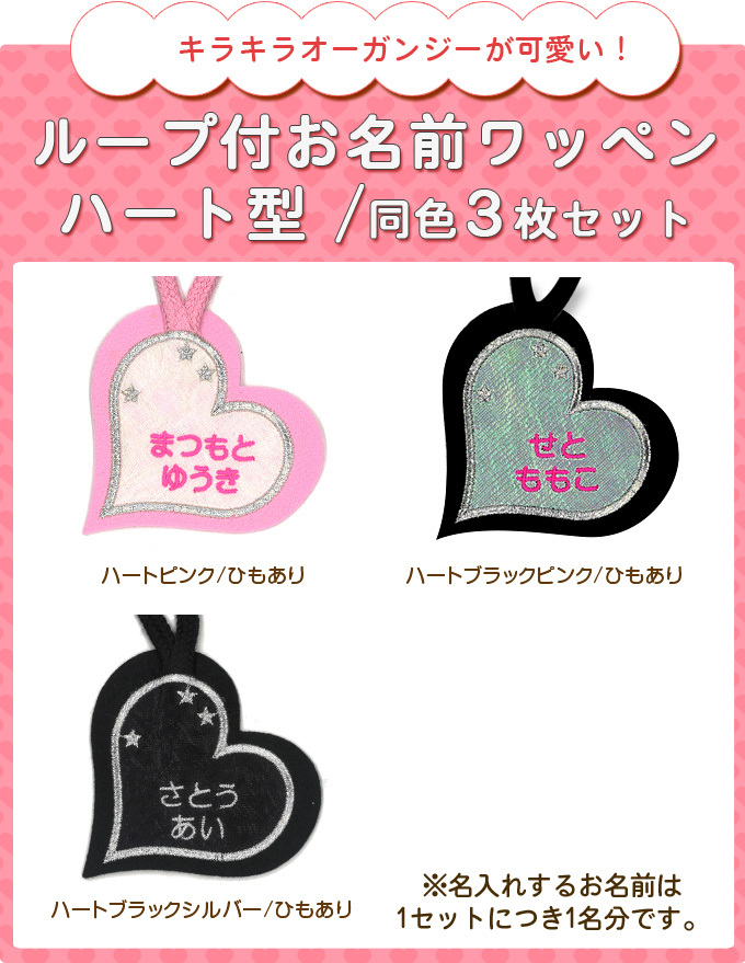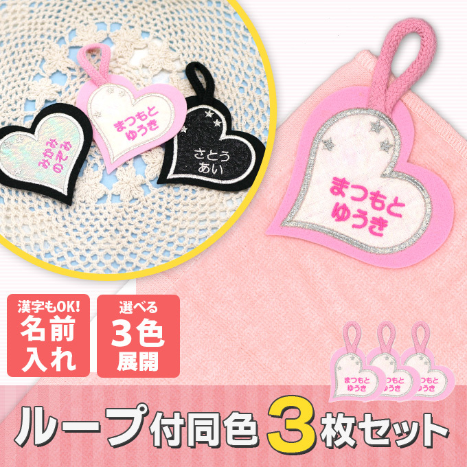 お名前ワッペン ループ タオル掛け ハート 3枚組 ネームワッペン アイロン 入園 刺繍 プレゼント OR