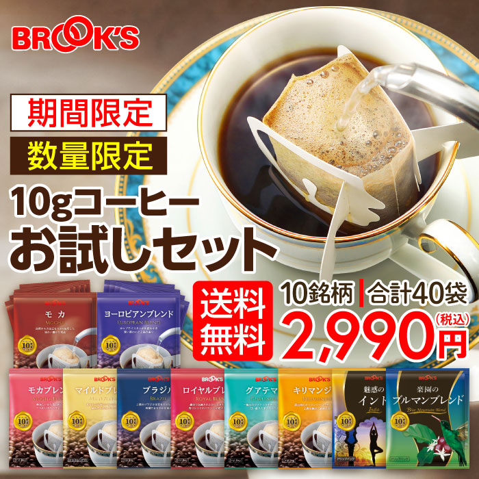 送料無料 期間限定 コーヒー ドリップコーヒー 10gお試しセット 40袋 数量限定 ドリップ 珈琲 ホット 個包装 飲み比べ 1杯10g 10種類 ブルックス BROOK'S