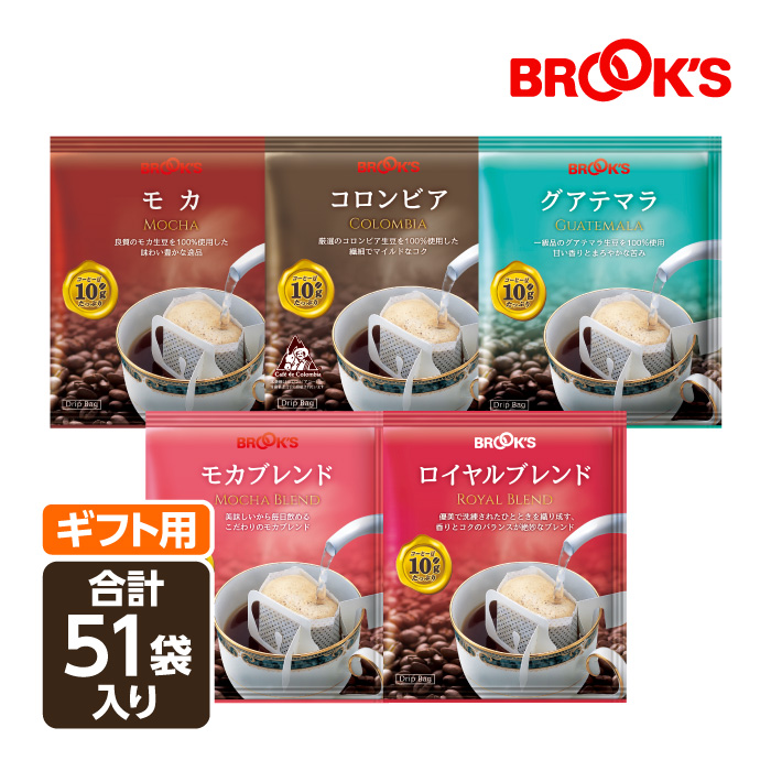 冬ギフト 2026 のし対応 贈り物 コーヒー ドリップ ドリップコーヒー 飲みやすいマイルドコーヒーセット 51袋 ドリップ 珈琲 個包装 1杯10g ブルックス