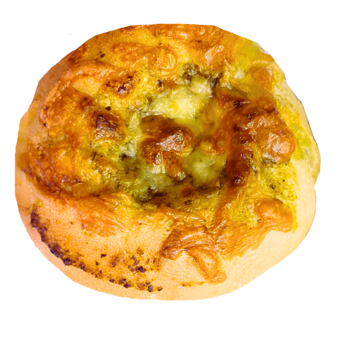 皮はパリッと中はもっちりした香りの良いプレーンベーグルにバジルペーストとチーズをトッピングして焼き上げました。