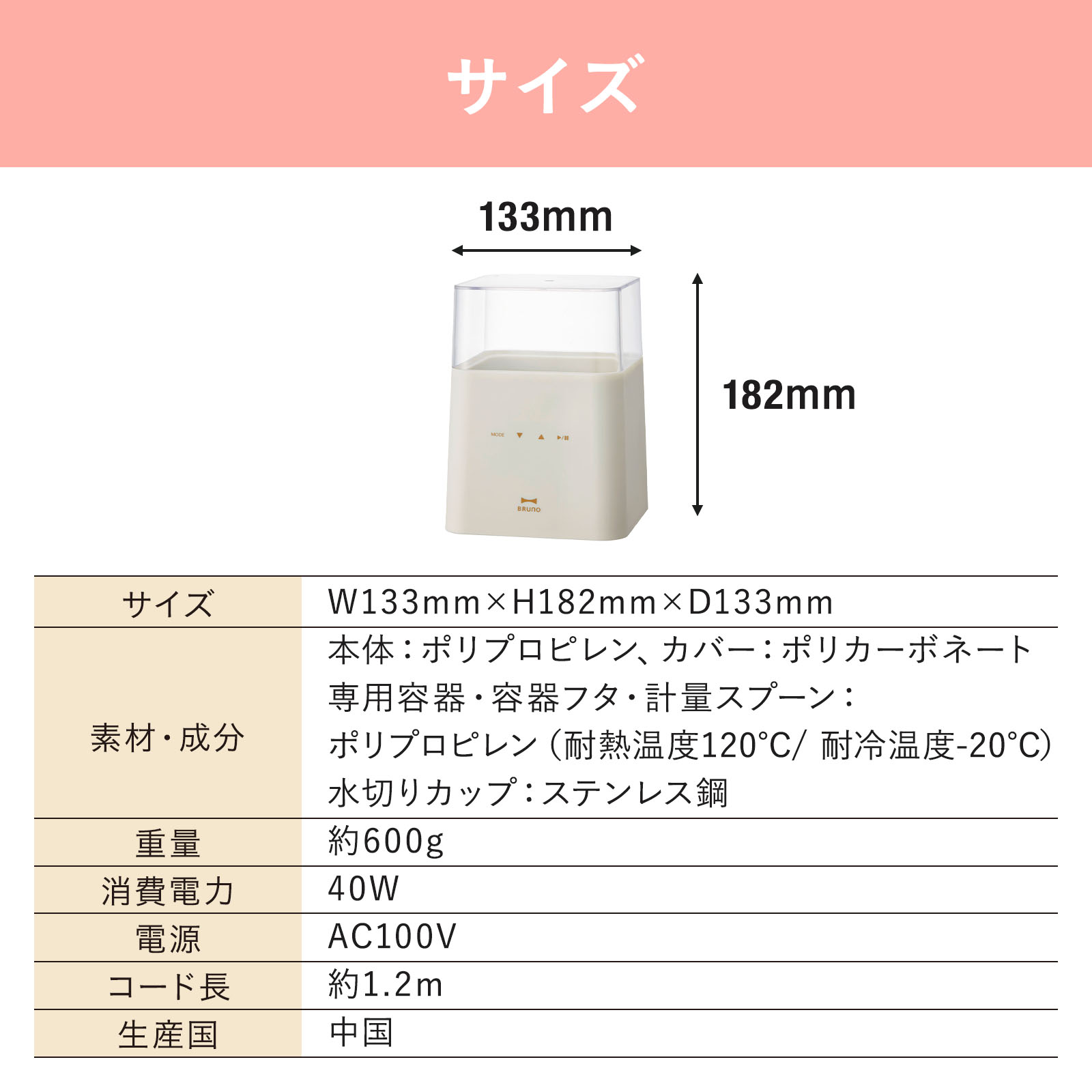 | サイズ | W133mm×H182mm×D133mm