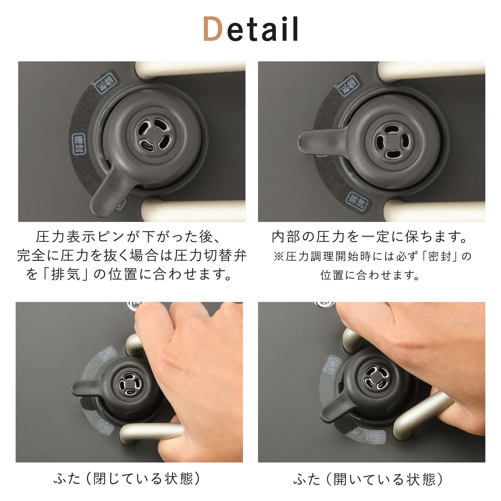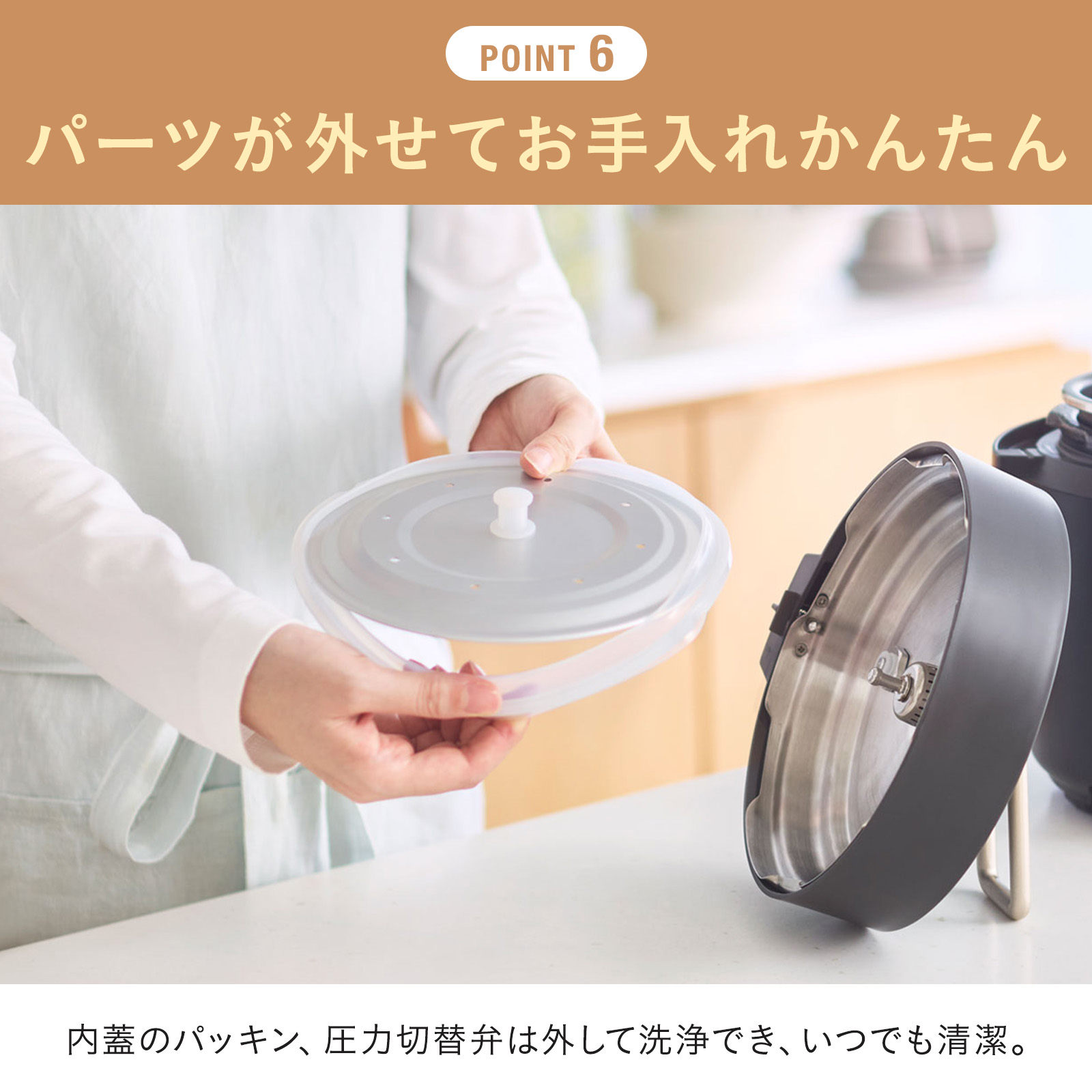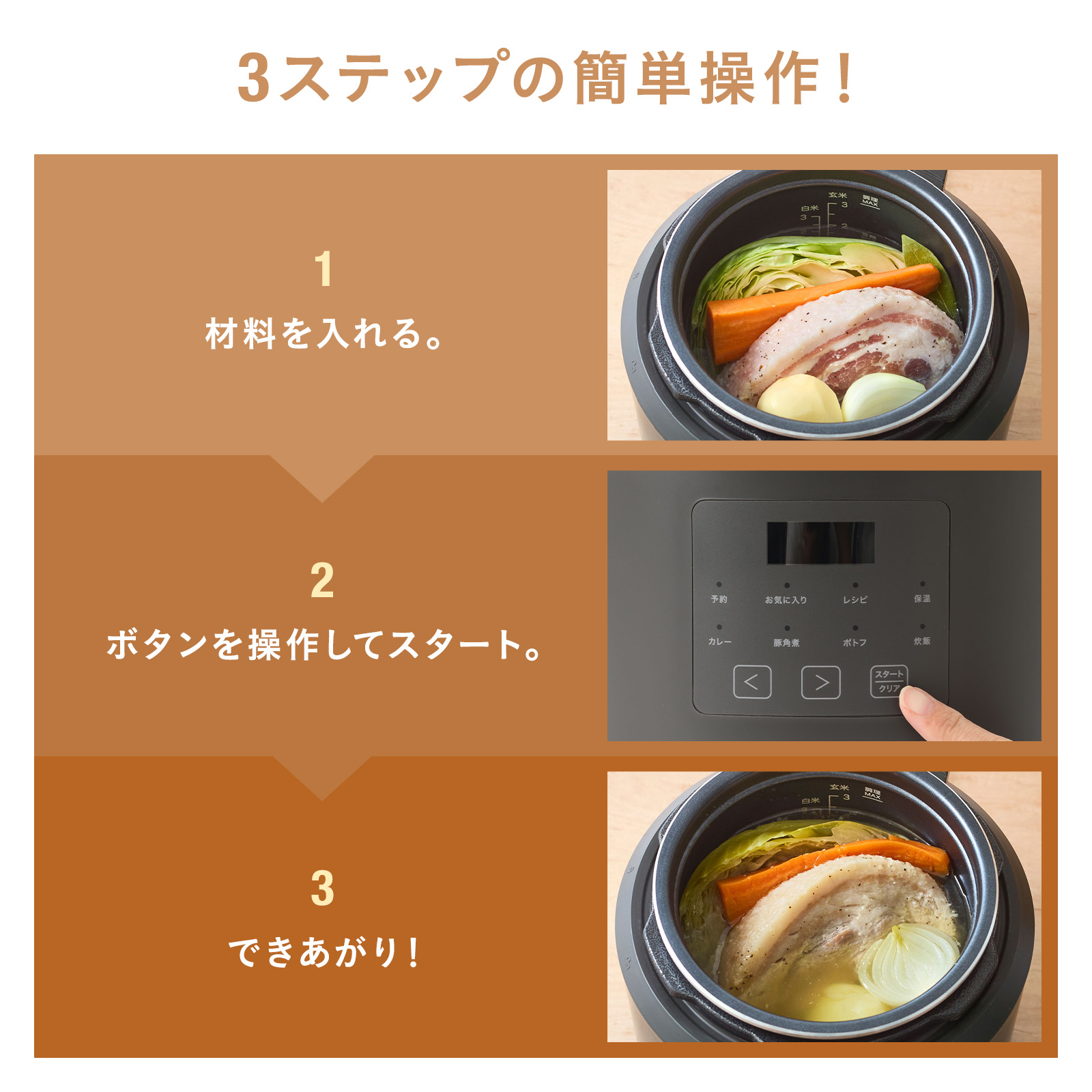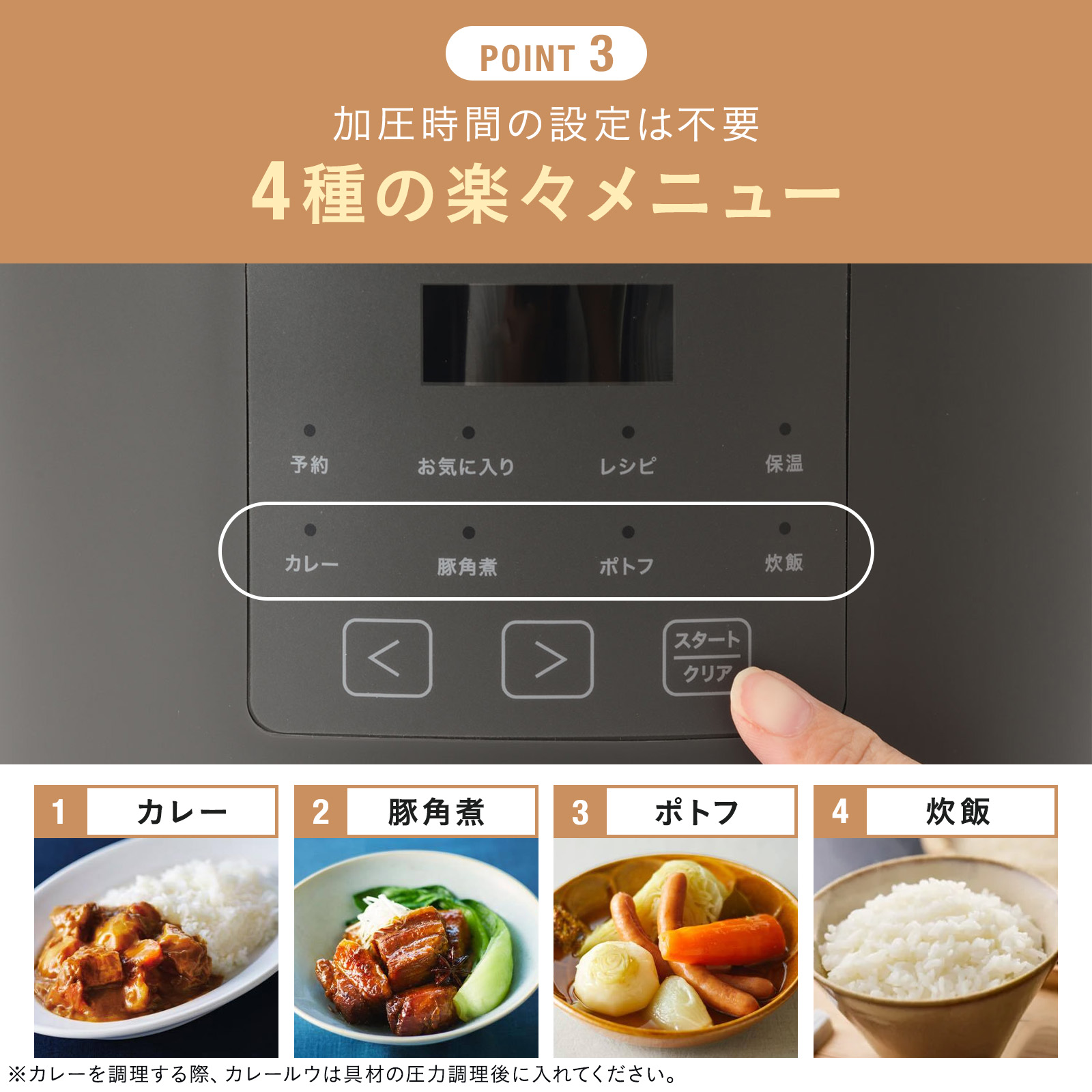 | 機能 | 調理容量:約1.2L/ 呼び容量(満水容量):約2.0L、定格消費電力:700W、使用最高圧力:70kPaゲージ圧 4種の楽々メニュー、予約モード、お気に入り登録モード、レシピモード(9種類の調理機能)、保温モード |