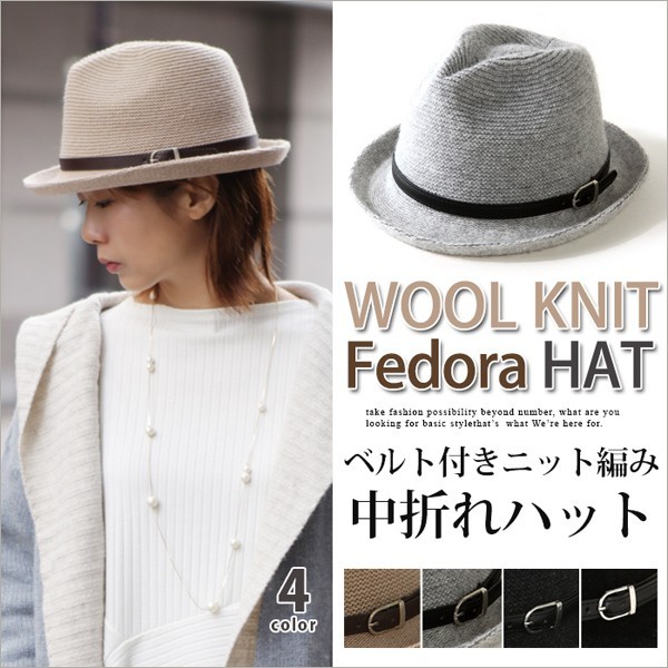 中折れハット レディース ニット ウール 秋冬 日焼け防止 ベルト付き 帽子 ニット帽