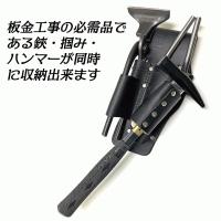 ■板金鋏とツカミバシの他に、斜め方向から収納出来るハンマーケースを付けた、補強革付の超頑丈黒革仕様の板金バサミケース!