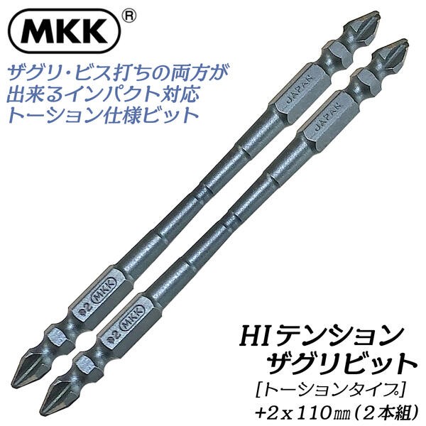 MKK 先端刃付き HIテンション ザグリビット +2x110 2本組 マグネット付 トーションビット インパクトドライバー対応 6.35mm 下穴 ビス打ち ZB-110T モトコマ