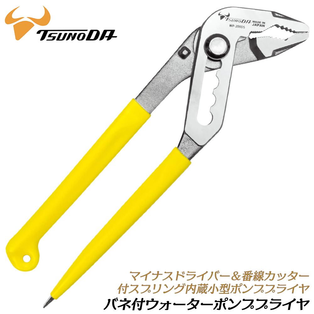 TTC 小型バネ付ウォーターポンププライヤー 200mm マイナスドライバー付 番線カッター付 スリムヘッド 水道 配管 ガス 空調 電材 設備 自動車 WP-200DS ツノダ