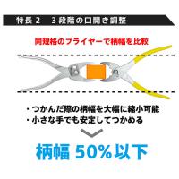 ●3段階口開き調整により掴んだ際の柄幅を縮小することができ、手の小さな方や女性でも楽々掴めます。