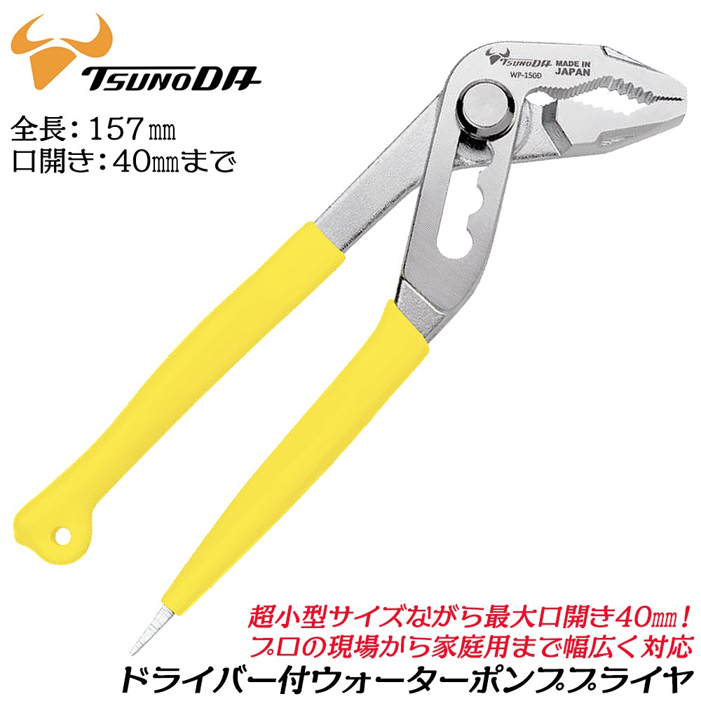 TTC 本格小型ドライバー付ウォーターポンププライヤー 150mm マイナスドライバー付 最大口開き40mm 非対象歯 電設 水道 配管 ガス 設備 日本製 WP-150D ツノダ