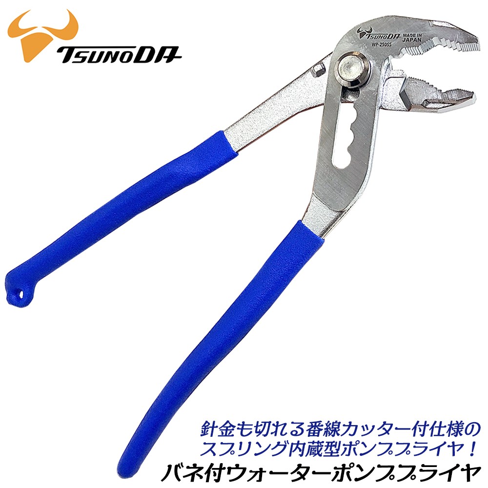 TTC バネ付ウォーターポンププライヤー 250mm 番線カッター付 スリムヘッド 水道 配管 ガス 空調 電材 設備 自動車 パイプ径58mmまで対応 WP-250SS ツノダ